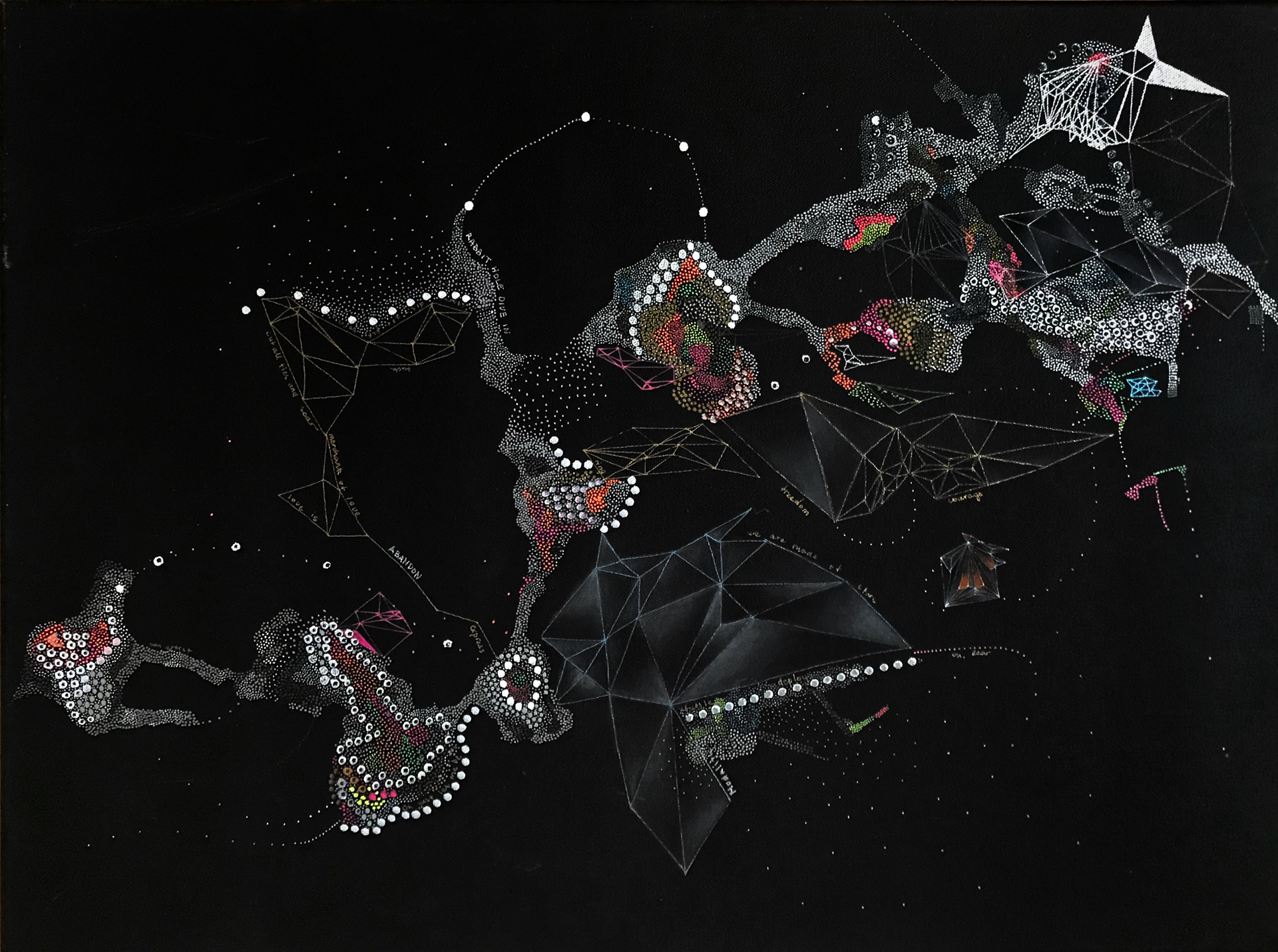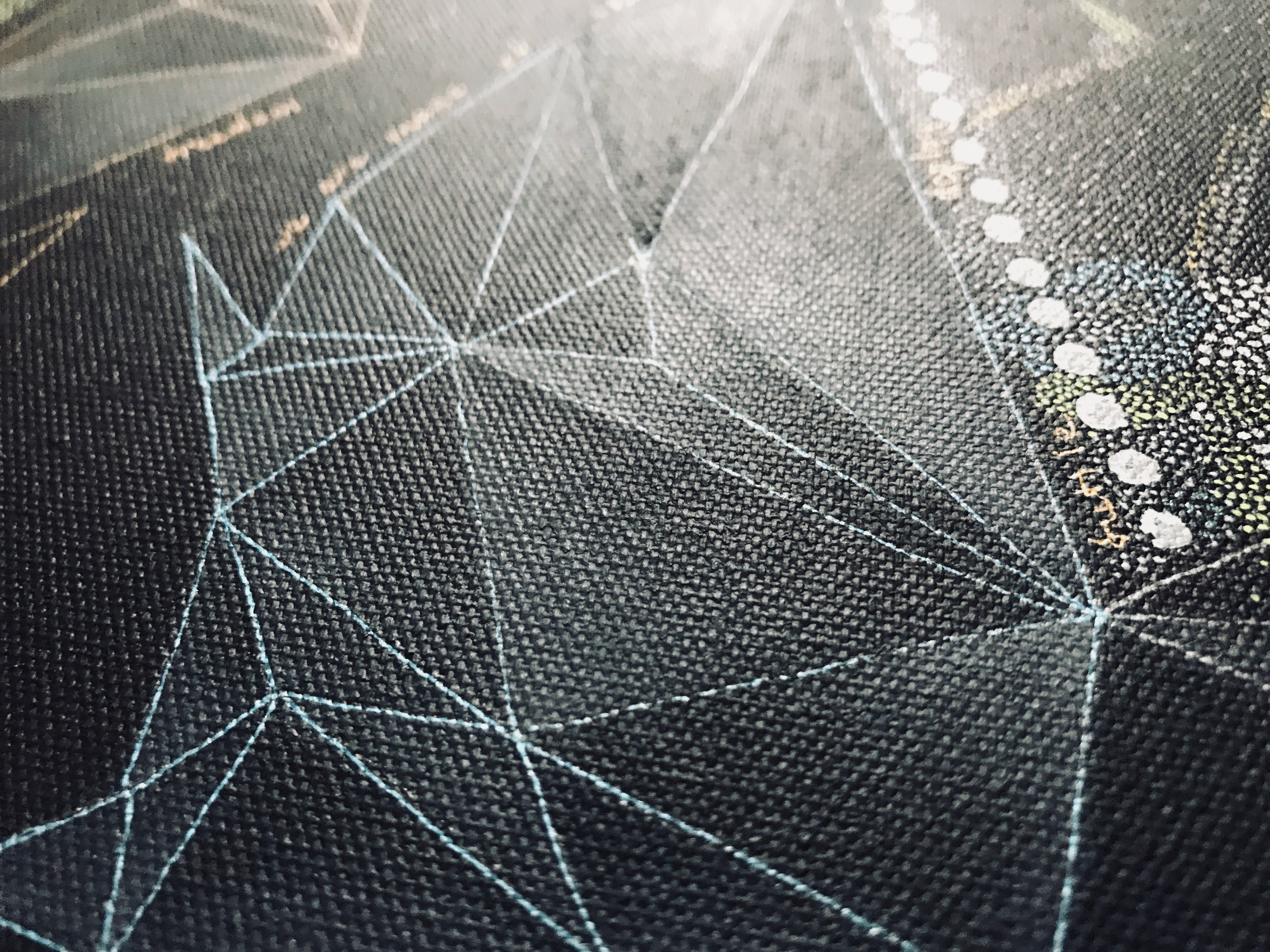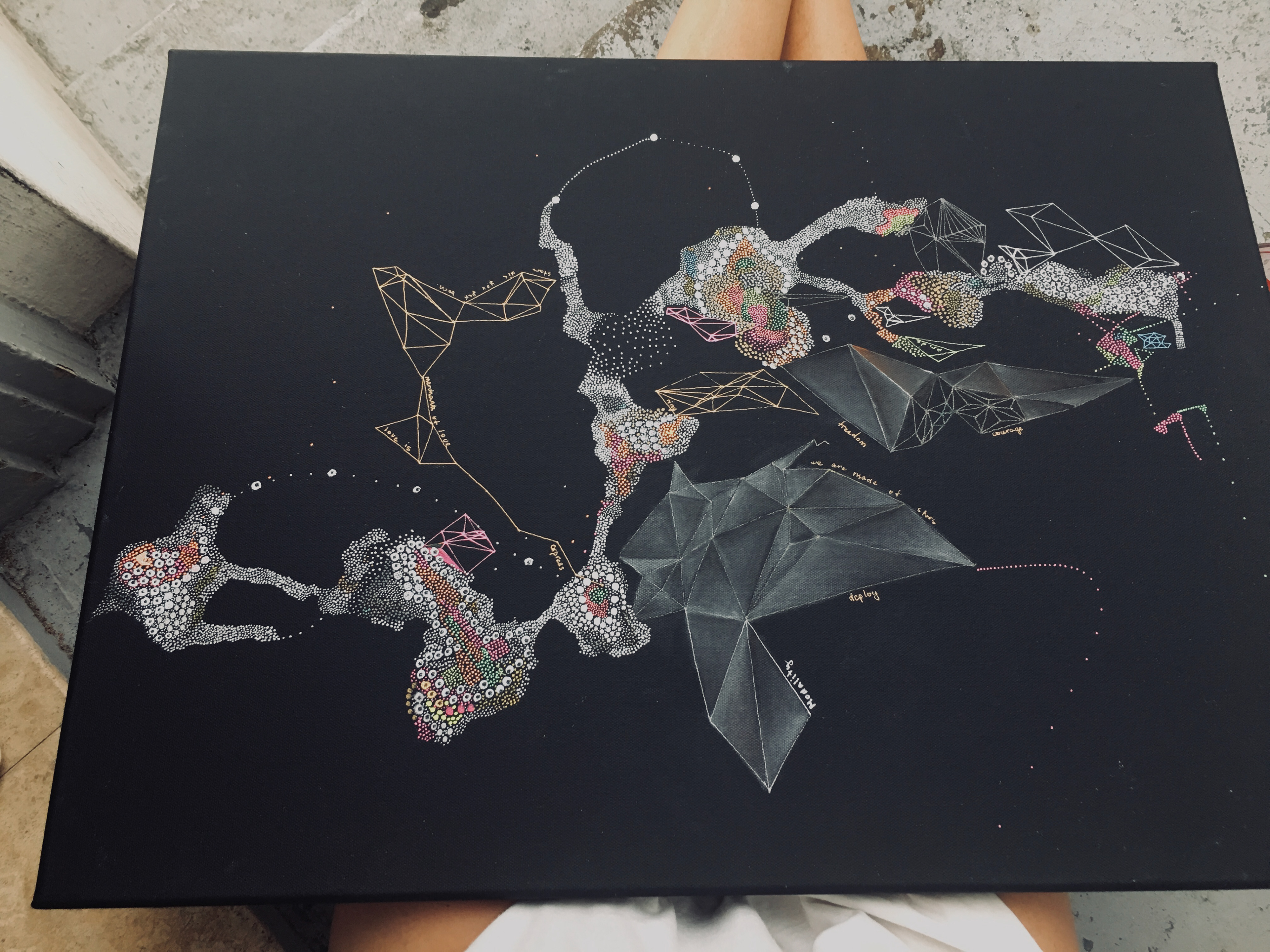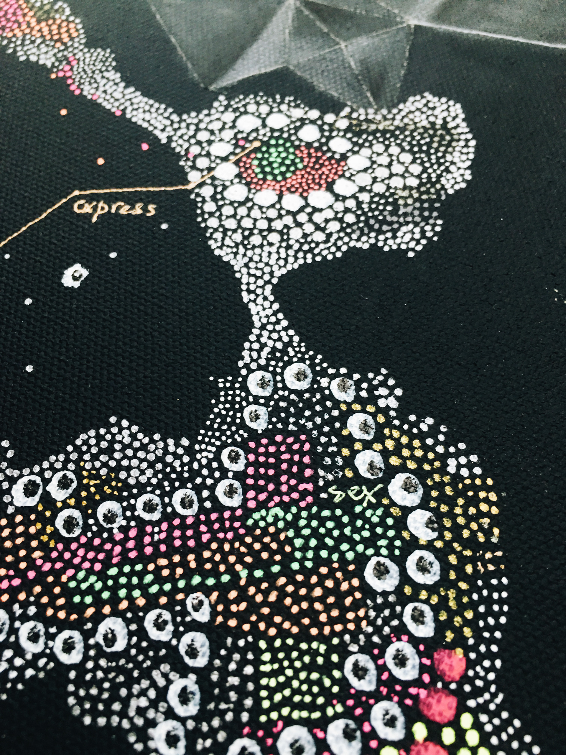 Size: 18 x 24 x 0.5 in Medium: pen, marker, pastel, acrylics on canvas Type: Drawing Subject Matter: Abstract Creation Date: c. March 2016
