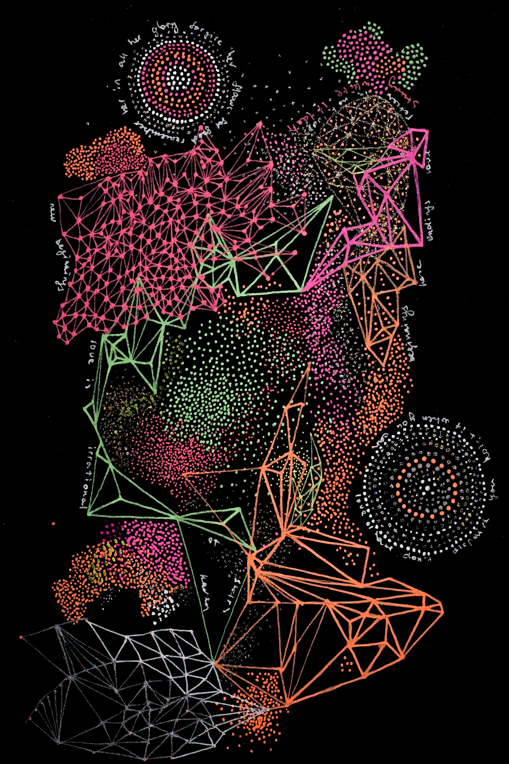 Strathmore black fine art paper. Gel pens, neon pens, neon pastels, pastels, acrylic markers, glitter gel pens. Glitter responds beautifully to variety of lighting conditions. Color seen on select artworks activates and glows in black uv / uv light, revealing additional hidden perspectives of the piece. Check back soon for additional demonstration ( videos and photographs of the artwork in variety of lighting conditions ) .